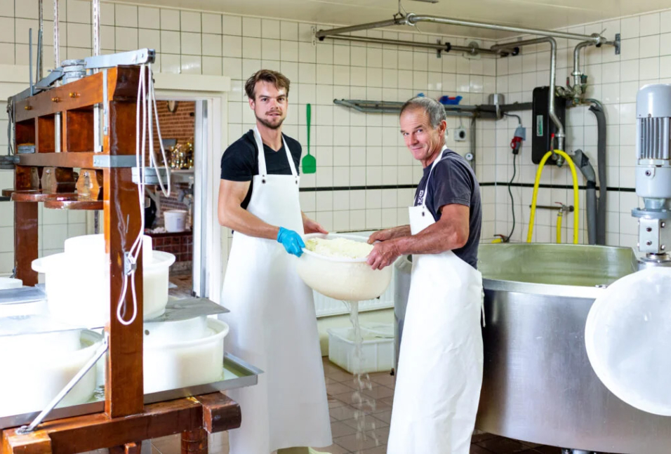 Nu werken vader en zoon zij aan zij. Jan zorgt voor de koeien, Joost pioniert en runt een Oogstwinkel in Leiden. Samen maken ze de kaas. “Dat is wat ons verbindt.”